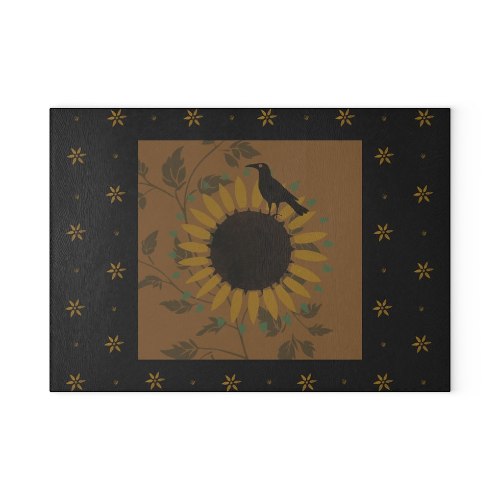 Sunflower and Crow Stencil Gold on Black Glass Cutting Board